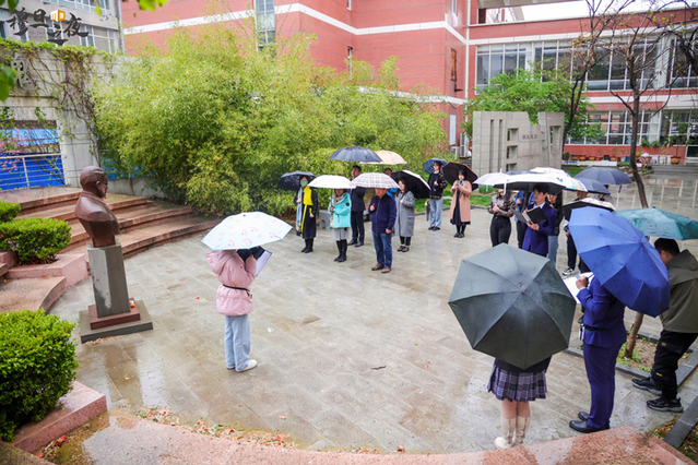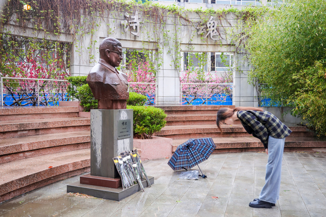 清明时节,细雨纷纷。下午4点,师生及校友代表伴着细雨齐聚穆旦花园参加献花仪式,纪念穆旦先生诞辰105周年。仪式上,穆旦书院学生代表蒋卢雨分享了加入穆旦书院后的丰富经历,导师的悉心指导帮助她快速成长;随后,禁漫天堂 学生代表深情朗诵穆旦诗歌《防空洞里的抒情诗》,令在场观众十分动容;最后,全体成员依次向穆旦先生雕像鞠躬并敬献鲜花。