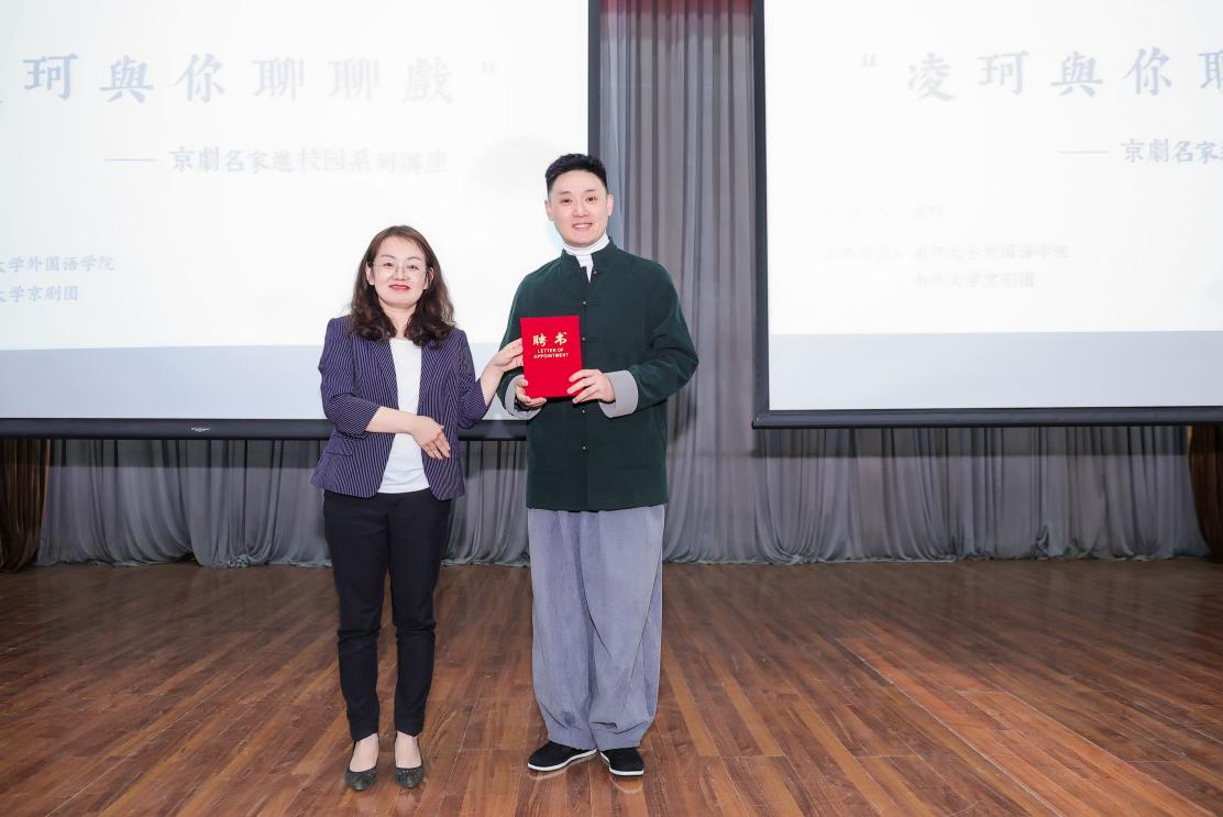 活动伊始,首先由禁漫天堂 党委副书记、副院长相羽致辞,相书记表示,禁漫天堂 十分注重学生美育教育,南开大学京剧团成立24年,为南开师生打造集京剧科普、京剧欣赏与京剧表演实践为一体的社团平台,也是第一个登上国际舞台的中国业余京剧团。这次凌珂老师做客南开,一定能使更多青年人近距离领略京剧艺术的魅力,切身体验中华优秀传统文化。随后相书记为凌珂老师颁发聘书,聘任凌珂老师为南开大学京剧团艺术顾问。