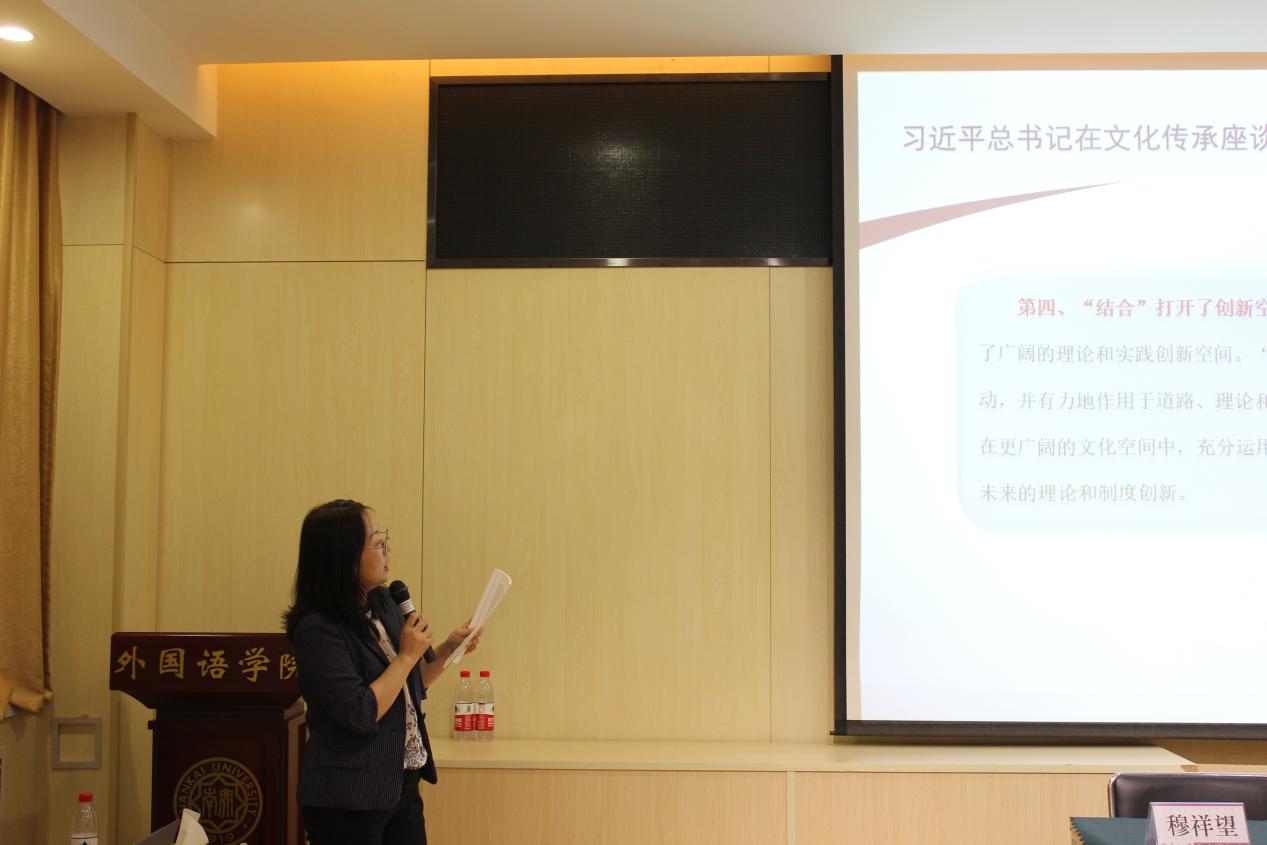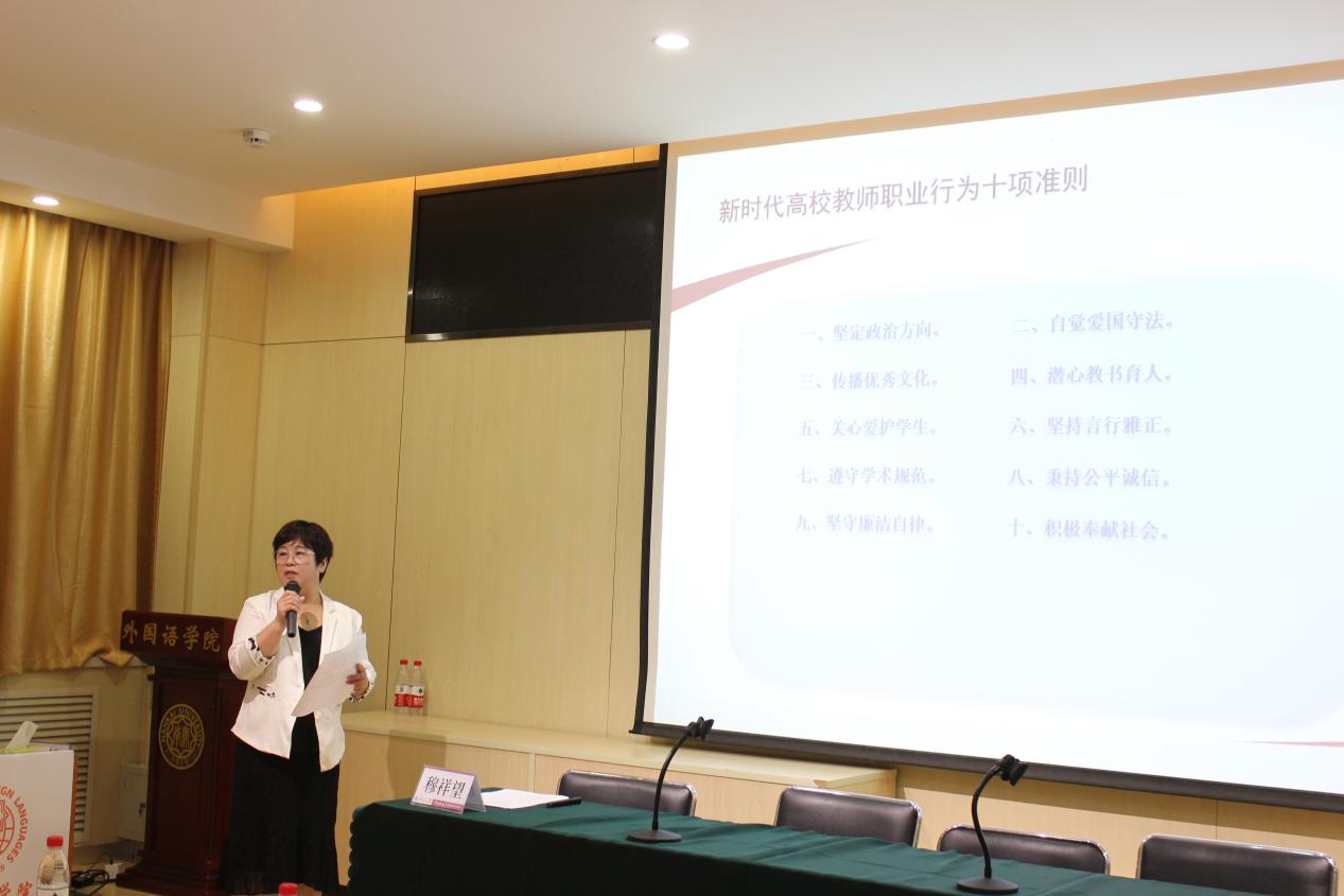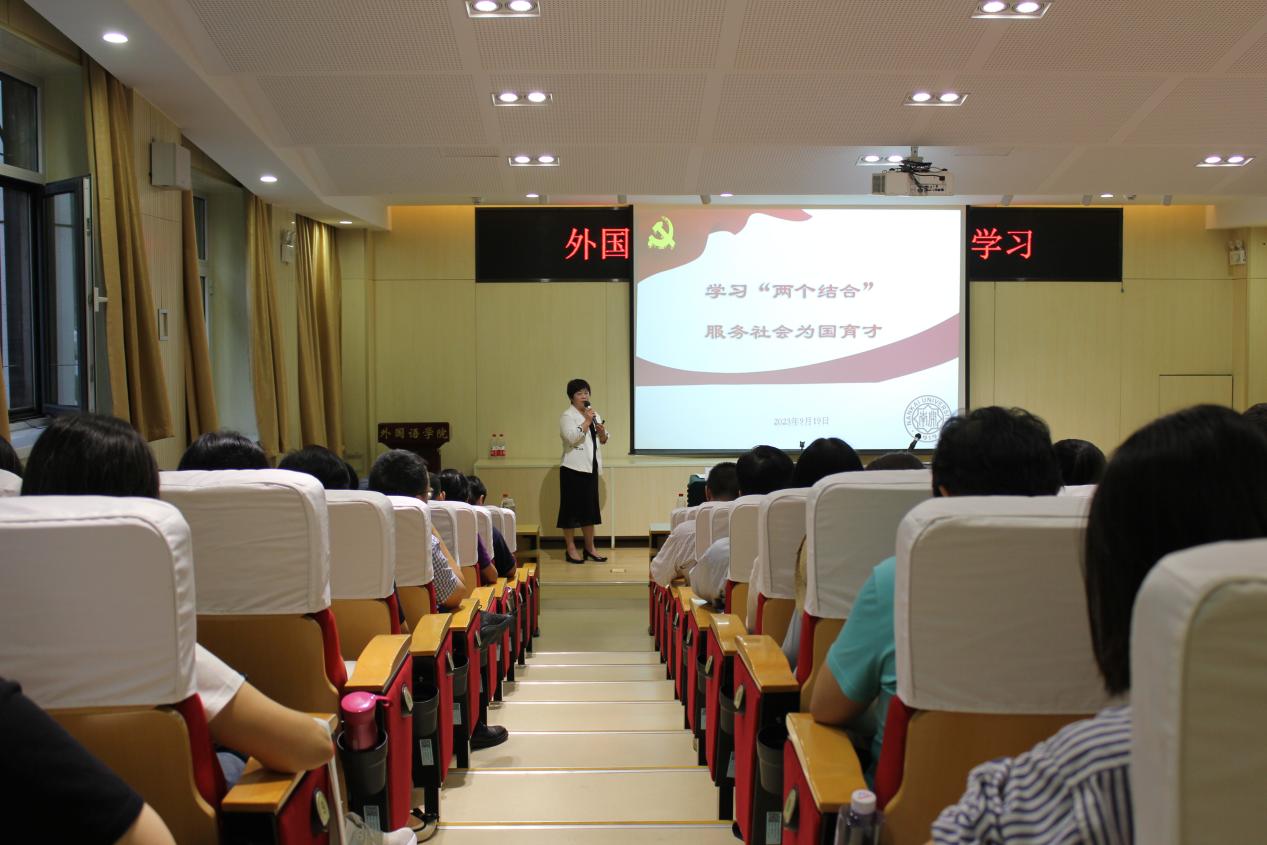 学院党委书记穆祥望以“学习‘两个结合’,服务社会,为国育才”为题,通过讲解党的二十大报告和习近平总书记在文化传承座谈会上的重要讲话中关于“两个结合”的内容,为大家阐述了如何深刻理解“两个结合”的重大意义。然后,穆祥望援引习近平总书记在文化传承座谈会上的重要讲话,提到要坚定文化自信,担负文化使命。最后,穆祥望重点讲述了如何学思践悟做实,培养优秀人才。从习近平总书记视察南开大学时的寄语谈起,她指出要将主题教育成效转化为文化传播与人才培养的强大动力,用习近平新时代中国特色社会主义思想凝心聚力,弘扬教育家精神,努力做到“心有大我、至诚报国的理想信念,言为士则、行为世范的道德情操,启智润心、因材施教的育人智慧,勤学笃行、求是创新的躬耕态度,乐教爱生、甘于奉献的仁爱之心,胸怀天下、以文化人的弘道追求。”要求全体教职工要用“十项准则”自律修身,做学生为学、为事、为人的示范。