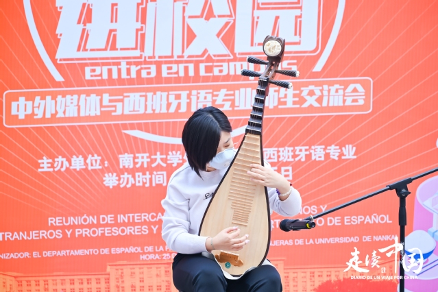 外院西班牙语系师生在朗园举办具有浓厚中国特色和天津地方风情的文艺演出,热烈欢迎参访团的到来。学院党委副书记、副院长相羽为本次活动致辞。西班牙语系主任谷佳维带来精彩的才艺——琵琶演奏:“送你一朵玫瑰花”,展示了南开西语人多元的人文素养。大二专业班王天宇同学表演了中国武术,赢得外宾的赞叹和掌声。两位西班牙语外教吴瑞龙(委内瑞拉)和墨麒麟(西班牙)的西语相声将这场演出推向了高潮:两位老师身着长衫、眉飞色舞、妙语连珠,精彩的表演使会场爆发出阵阵笑声。