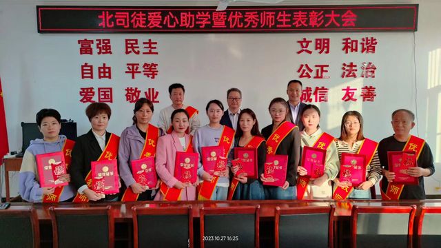 南开新闻网讯 10月27日,“北司徒爱心助学暨优秀师生表彰大会”在河北省河间市尊祖庄镇北司徒村举行。这是南开大学中国式现代化乡村工作站河间工作站设立以来,与当地政府、南开校友和社会爱心人士共同举办的支持义务教育活动。旨在促进当地中小学教育教学发展,激励教师爱岗敬业,鼓舞学生为“中华崛起而读书”,为乡村振兴添砖加瓦。