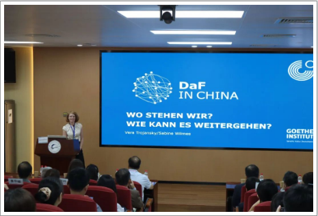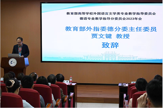 开幕式后,贾文键教授与Sabine Wilmes女士分别作主旨报告。贾文键教授作为《新经典德语》系列教材总主编,以“各美其美,美人之美,美美与共,文化大同”为题阐释了新型教材《新经典德语》的文化教学理念与策略。Sabine Wilmes女士的主旨报告以“歌德学院的语言工作”为题,强调歌德学院语言工作的当下重点是激发人们的德语学习兴趣,加强文化交流。