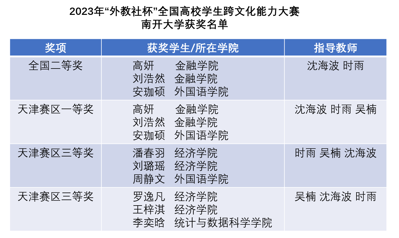 (通讯员时雨 唐磊)12月初,2023“外研社.国才杯”“理解当代中国”全国大学生外语能力大赛(简称为“外研社国才杯”外语能力大赛)和2023年“外教社杯”全国高校学生跨文化能力大赛(简称为“外教社杯”跨文化能力大赛)两大英语赛事圆满落幕。我校选手今年的参赛成绩创我校参与两项赛事以来最佳成绩,展现了南开学子的风采。
