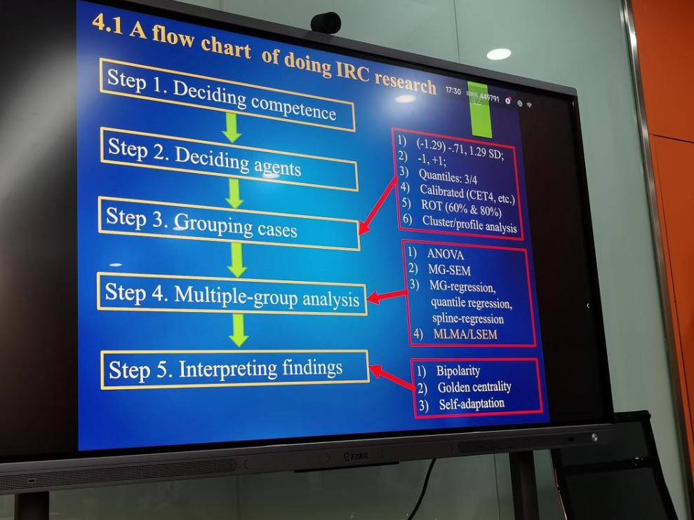 在此后的讲座中,蔡雨阳教授详细地介绍了岛脊曲线理论与现代教育心理学理论的衔接问题,并介绍了语言教育研究领域进行岛脊曲线理论适用性研究的具体方法。蔡雨阳教授指出,在语言教育实证研究中,岛脊曲线的应用需包含五个步骤(如下图所示),详细阐释了数据分析可用的核心统计方法及结果阐释可用的理论概念。此后,蔡雨阳教授还介绍了教育心理学研究领域的重要理论和研究前景,很好地启发了在场师生。