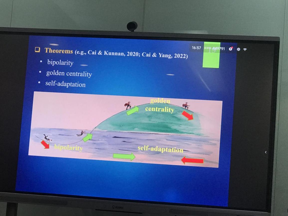 此后,蔡雨阳教授向线上线下师生详细介绍了岛脊曲线理论的概念和基本原理。蔡雨阳教授详细阐述了岛脊曲线理论的三个核心概念:Agents(能动体、贡献者)、Patterns(模式)、Theorems(法则)。其中,在介绍Agents概念时,蔡雨阳教授生动地使用了“A”、“C”、“B”三个字母帮助线上线下师生快速理解了研究这一概念时需要考虑的因素:情绪因素(Affect)、认知因素(Cognition)、混合因素(Blended Factors)。