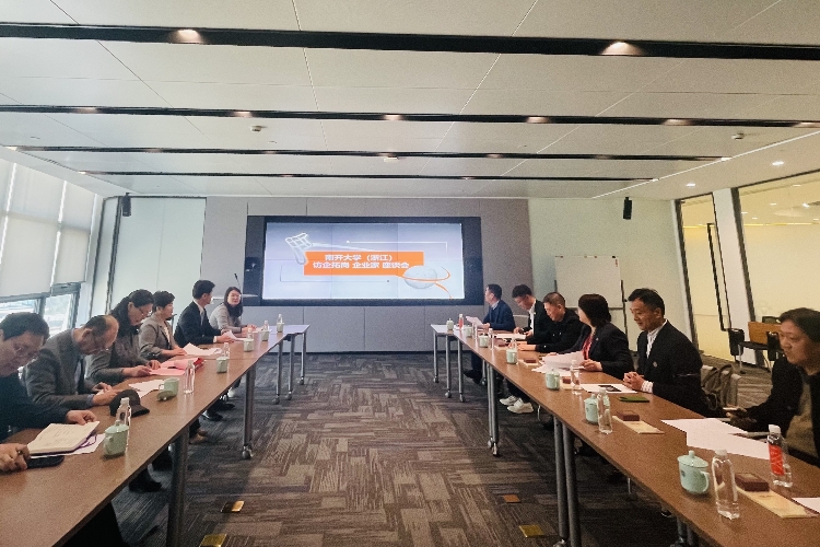 参观活动后,举行了南开大学浙江访企拓岗企业家座谈会。杭州雄轩科技有限公司、浙江省微笑明天慈善基金会、万城万充有限公司、铭安数智科技集团、中金财富、佑嘉生物医药科技有限公司、汇通达股份浙江公司等二十余家企业家代表参会。南开浙江校友会秘书长、浙江众合孵化器有限公司执行董事骆宝主持会议。