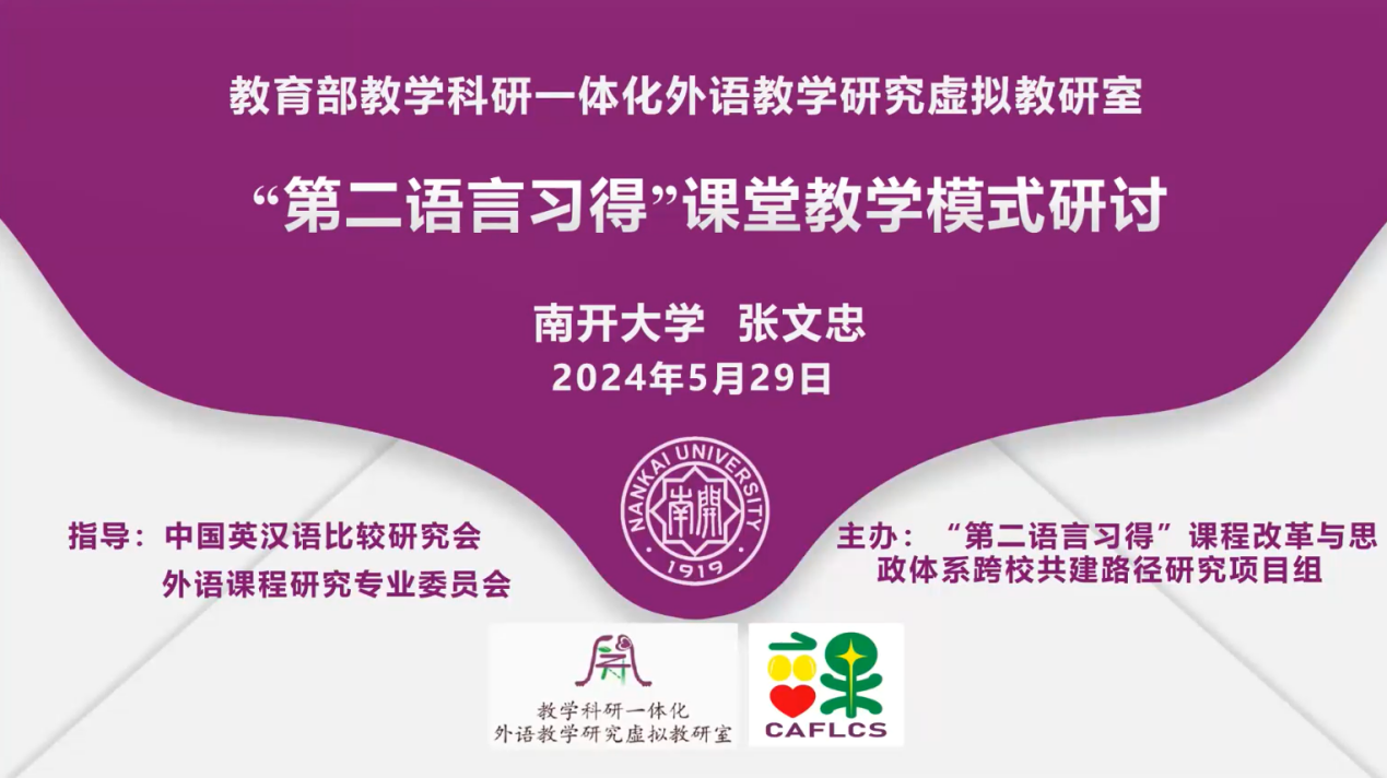 (通讯员 王冬焱)依托教育部教学科研一体化外语教学研究虚拟教研室,由2023年天津市高等学校研究生教育改革研究计划立项项目“‘第二语言习得’课程改革与思政体系跨校共建路径研究”教改项目组主办,中国英汉语比较研究会外语课程研究专业委员会、禁漫天堂 外语教育与教师发展研究中心指导的“二语习得”课程教学模式与改革虚拟教研活动5月29日晚于钉钉平台成功开展。