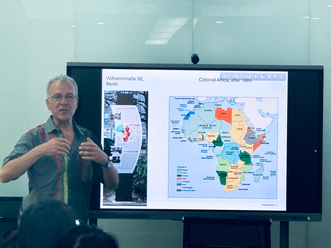 讲座开端为德国在非洲殖民历史缘起。他指出,尽管德国和瑞士在非洲殖民史上影响深远,但由于认知偏差,公众对于诸如瑞士如何借助德国势力间接在非洲殖民等问题并不了解。其中,教授特别剖析了柏林西非会议对殖民历史的影响,以及1904-1907年德国在纳米比亚殖民暴力事件及其赔偿争议。