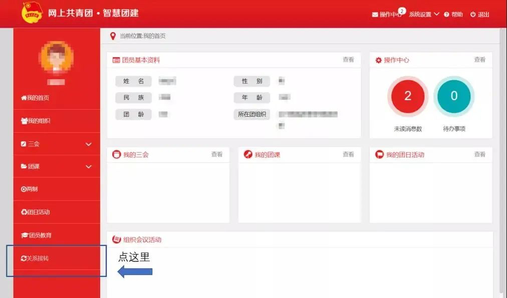 1.登录“智慧团建系统”,进入“个人中心”;登陆账号信息咨询原单位(学校)团组织。