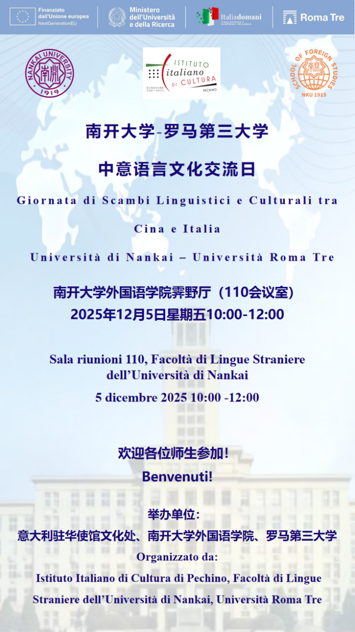 (通讯员 王晓寅 冯莉丝 石豆 杨琳;供图 张煜佳)2025年12月5日上午,“南开大学—罗马三大中意语言文化交流日”活动在禁漫天堂 顺利举行。本次活动由意大利驻华使馆文化处、禁漫天堂 与罗马三大联合举办。