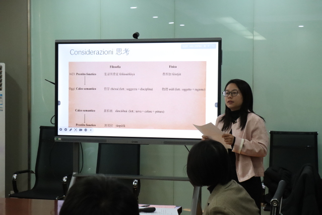 杨琳教授全面介绍了中国意大利语教育的历史与现状、人才培养、师资建设、教学改革、学术组织及合作前景。冯莉丝博士讲解了汉语中的意大利语外来词。倪杨老师则分享了中国意大利语二语习得研究的历史与现状及未来发展趋势。